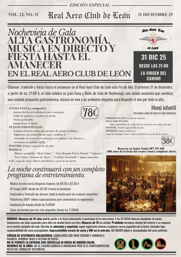 Este 31 de diciembre, vive una Nochevieja de Gala en el Real Aero Club de León: cena espectacular, Baile de Gala y fiesta hasta el amanecer en un entorno único.